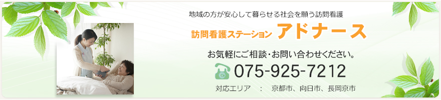 訪問看護ステーション アドナースは、2010年11月に京都市西京区に開設しました。住み慣れた場所でいつまでも生活していたい、病院での治療が終わったら療養は自宅で行いたい、入院が嫌だ、いろいろな思いを持った方達が在宅生活をされておられます。